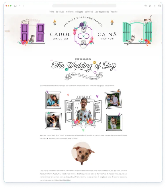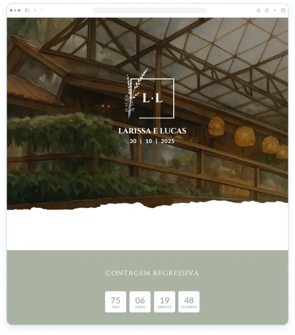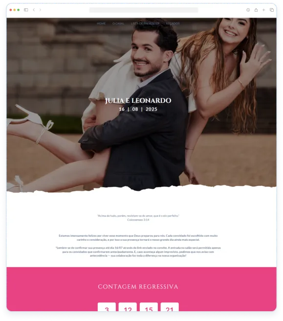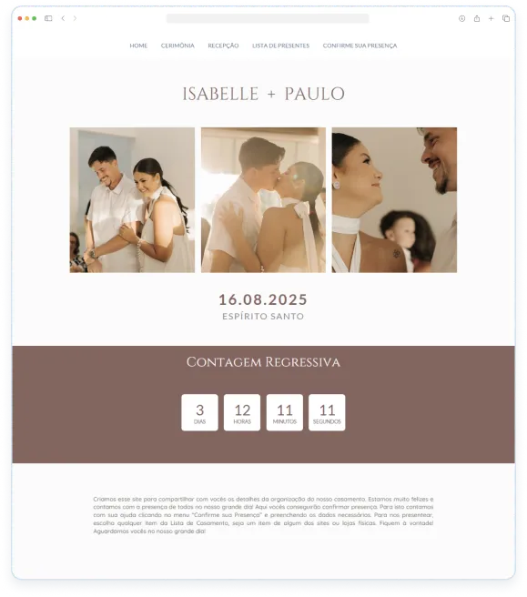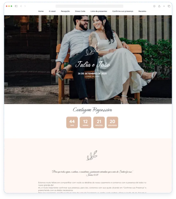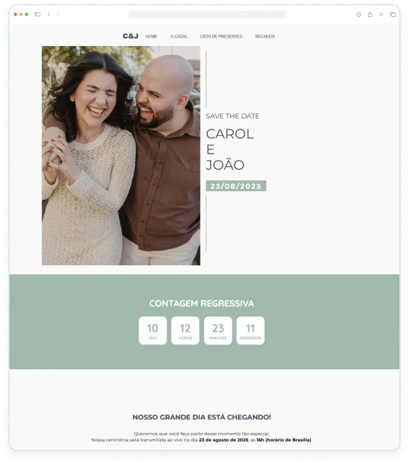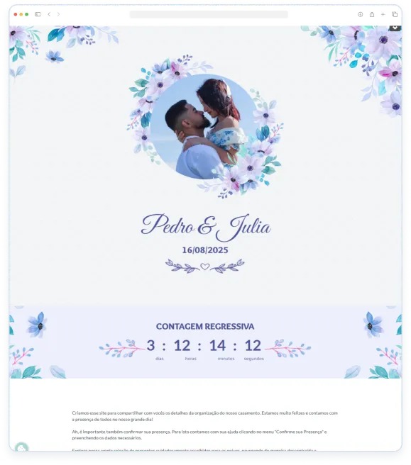 Todos os recursos para personalizar o seu site: temas, fotos, músicas, save the date, convite digital, confirmação de presença e muito mais...